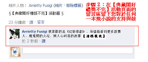 步驟2:在【典藏閣好禮獎不完】活動頁面的留言區留下您對於任何一本飛小說的支持與鼓勵&【請標籤我】四個字。